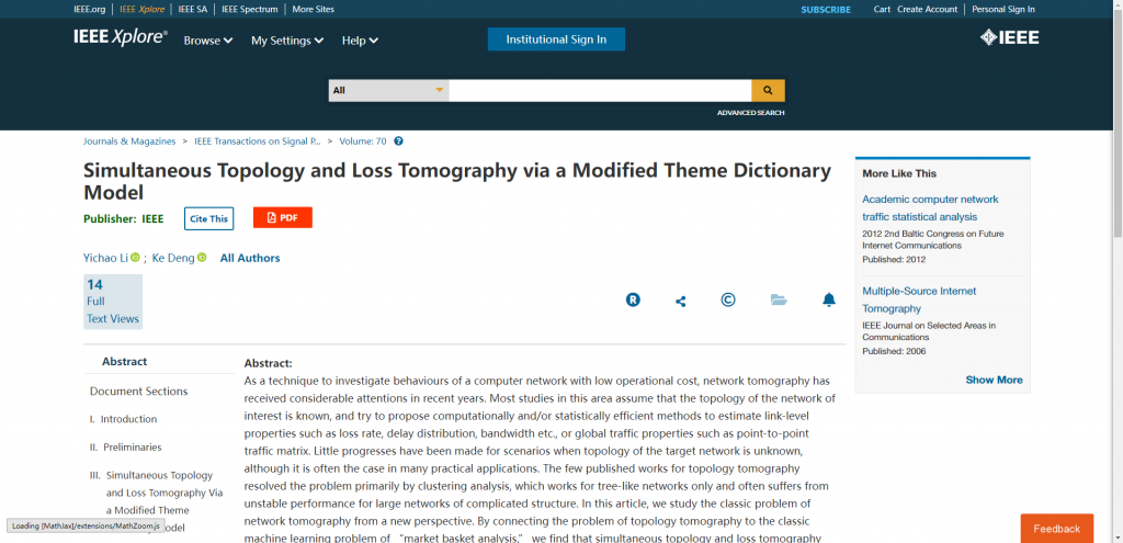 研究中心邓柯副教授课题组在信号处理领域的顶级期刊IEEE Transactions on Signal Processing发表了题为”Simultaneous Topology and Loss Tomography via a Modified Theme Dictionary Model“的论文。通过对网络透视过程建立经典三级