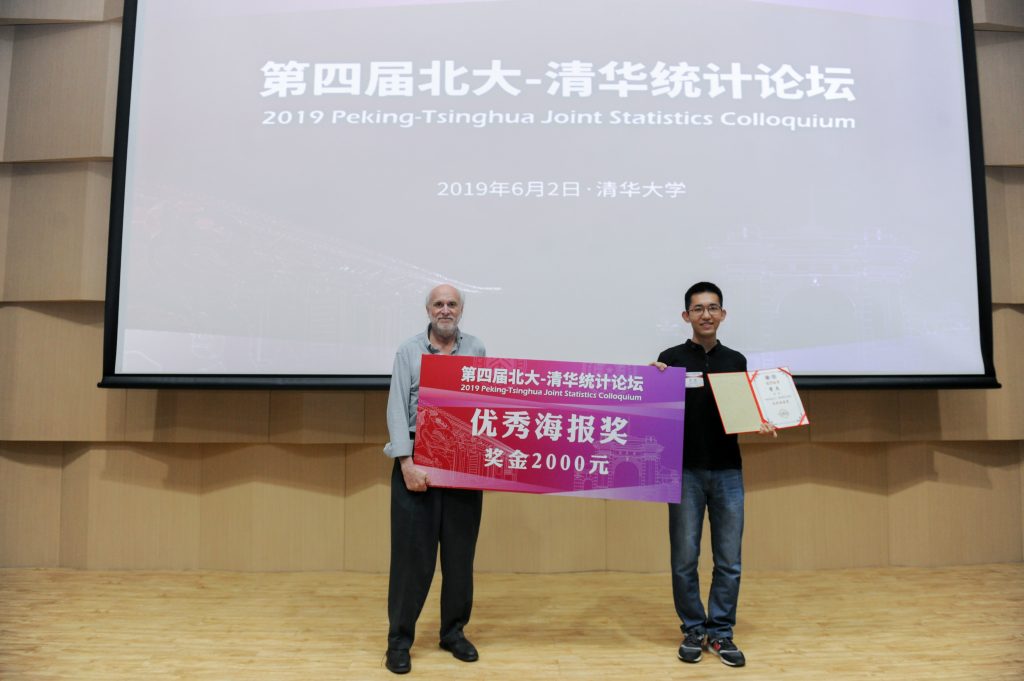 姚方教授为“第四届北大-清华统计论坛”优秀海报奖获得者——北京大学虞俊同学颁奖。