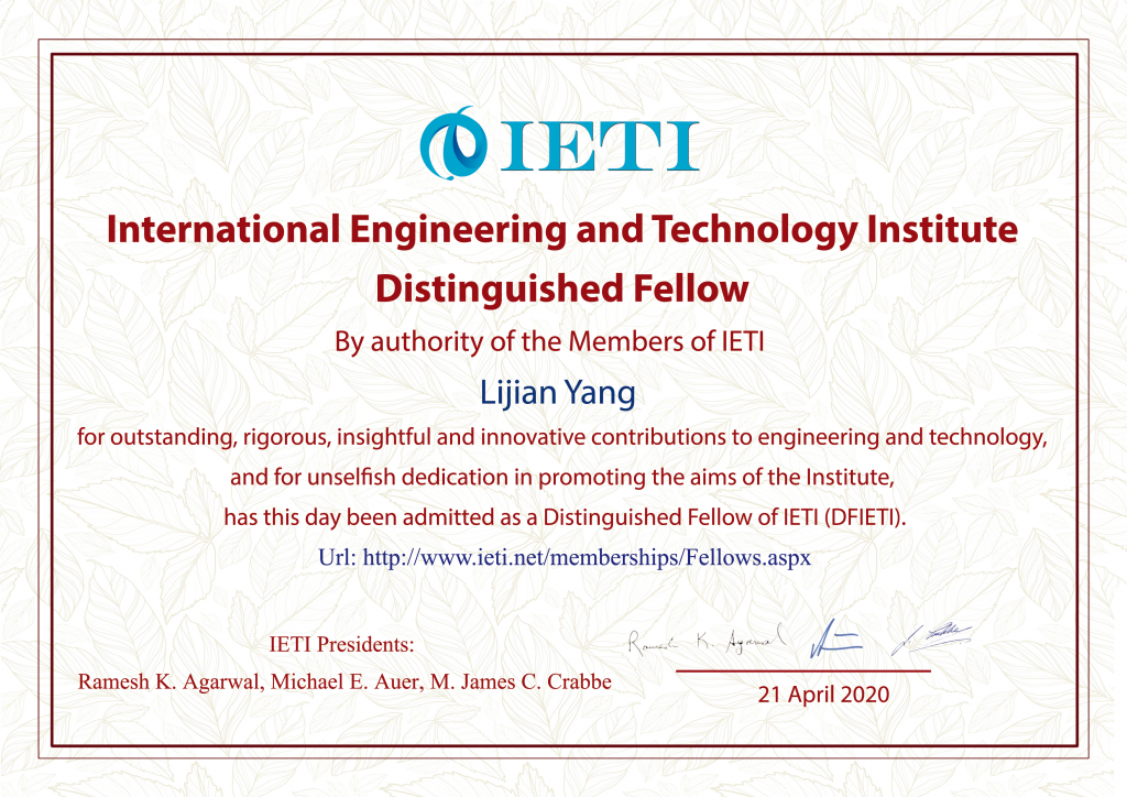 “杨立坚,因对工程与技术做出的出色、严谨、有深刻洞察力和富于创新性的贡献,以及为了促进协会的目标的无私奉献,经国际工程技术协会全体会员授权,今日当选为国际工程技术协会杰出会士。