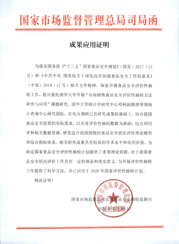 统计咨询中心团队承担的研究项目——“市场销售食品安全评价性抽检方法研究与应用”通过国家市场监督管理总局结题验收。该项目受国家市场监督管理总局委托,力求以我国食品安全抽检数据为基础,研发制定适合我国监管需求的食品安全状况评价模型、抽样方法以及相应的实施和应用细则。项目成果获国家市场监督管理总局高度评价,成功应用到2020年度的国家食品安全评价性抽检工作当中。
