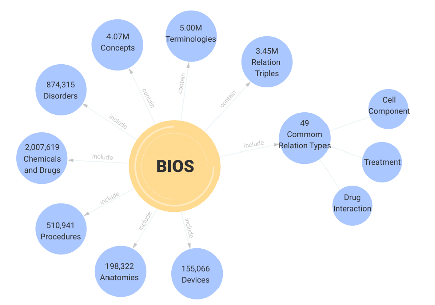 研究中心俞声副教授带领团队进行了长达5年的技术攻关,先后开发了基于图分割与深度学习的中文电子病历无监督多粒度分词及术语提取[1]、知识决定的医学术语向量化及正则化[2]、高通量医学关系提取[3,4]、生物医学自动翻译[5]等技术,为数据驱动的大规模图谱自动构建建立了基础,并于2020年11月与IDEA研究院沈向洋院士团队形成合作。在领先算法、强大算力和超大规模语料数据的支持下,仅用短短一年时间,双方团队便从原始底层医学术语开始,建立了全新的具有完整自主知识产权的中英文双语医学知识图谱BIOS,其规模整体接近现有权威知识图谱UMLS,并在内容质量上形成多点超越。未来,经典三级