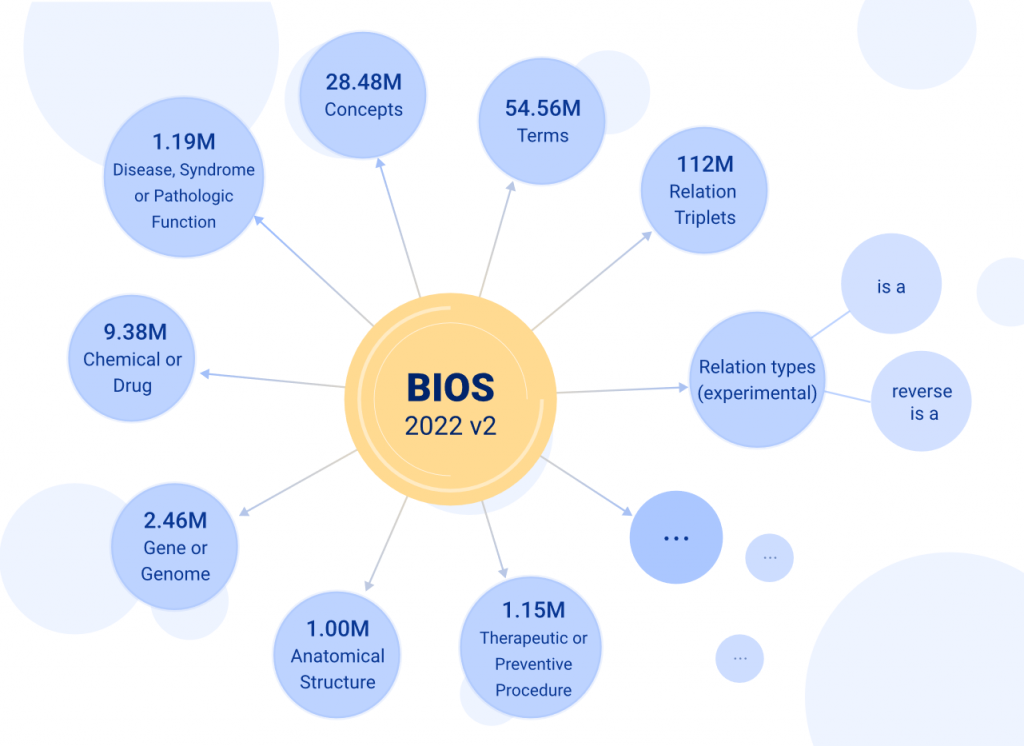 基于算法驱动、开源开放理念,以CC BY-NC-ND 4.0协议发布的BIOS中英文知识图谱自2021年11月发布以来受到了广泛关注。BIOS是首个完全由机器学习算法生成的大型开放生物医学知识图谱,其术语发现、语义分析、概念生成、关系发现、跨语言对齐完全由模型自动实现。在本次更新中,研发团队根据真实数据效果,不断强化算法技术,终于取得了振奋人心的突破性进展,使新版BIOS(2022V2版)一举达到了2848万概念、5456万术语(3348万英文、2108万中文)的巨大体量,术语质量也得到进一步提升。