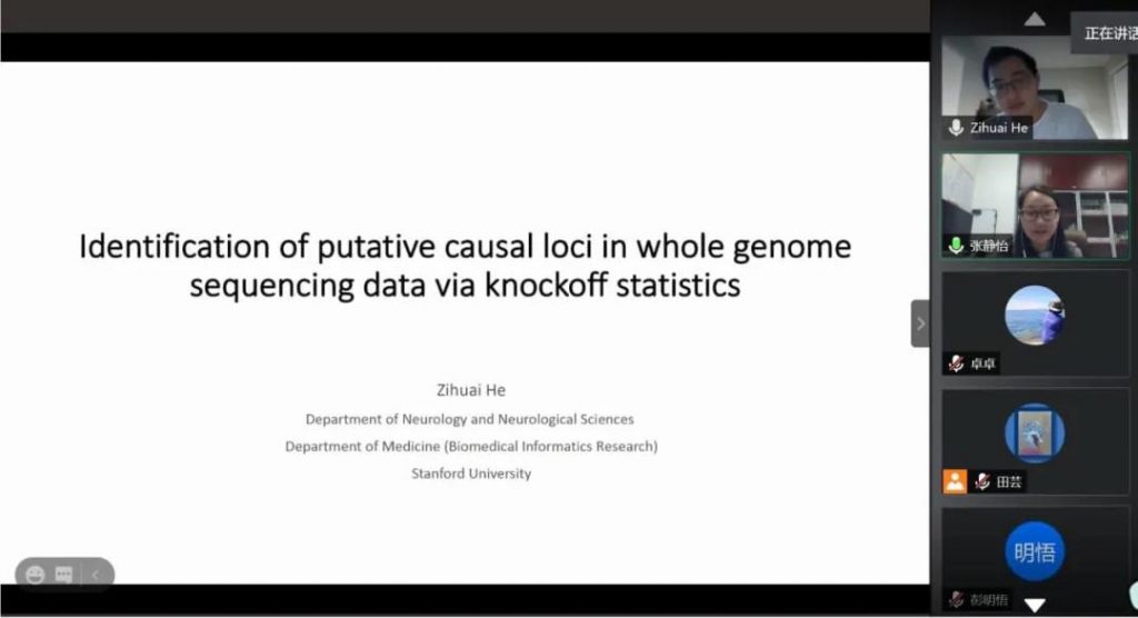 2021年5月7日,斯坦福大学何子淮助理教授通过线上平台与中心教员深入交流,并进行线上学术报告,报告的题目是:Identification of Putative Causal Loci in Whole-genome Sequencing Data via Knockoff Statistics。