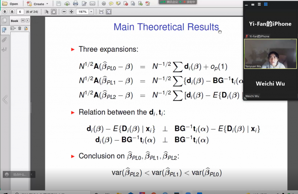 2021年11月8日,宾州州立大学马彦源教授通过线上平台与我中心教员深入交流,并进行线上特邀报告,报告的题目是Robust and Efficient Estimation under Nonignorable Missing Response。